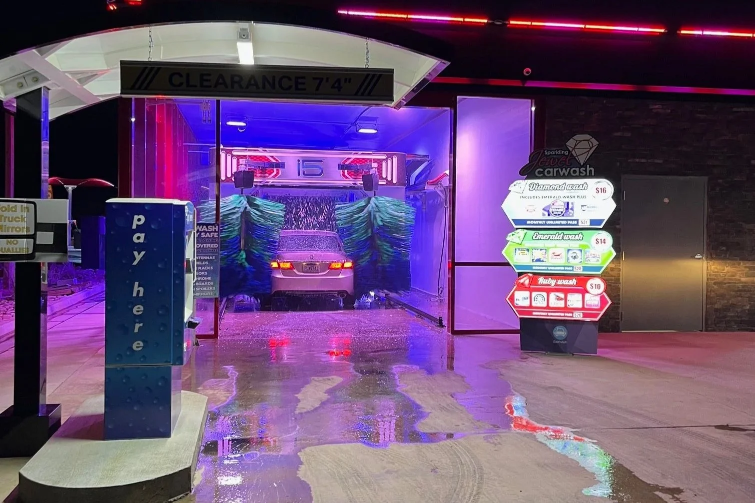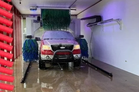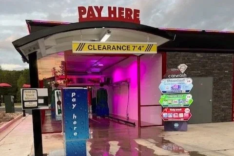 This double automatic carwash is in a glass building, which allows a colorwash light show to shine through and turn heads in cars passing by. This has contributed to a higher than average night business, and customers can join a membership program to see the show as often as they wish.